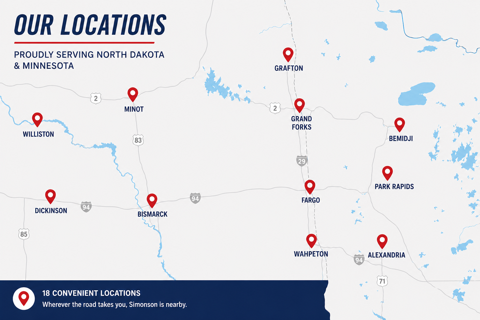 With multiple locations across North Dakota and Minnesota, Simonson is always nearby when you need fuel, coffee, or a quick stop.