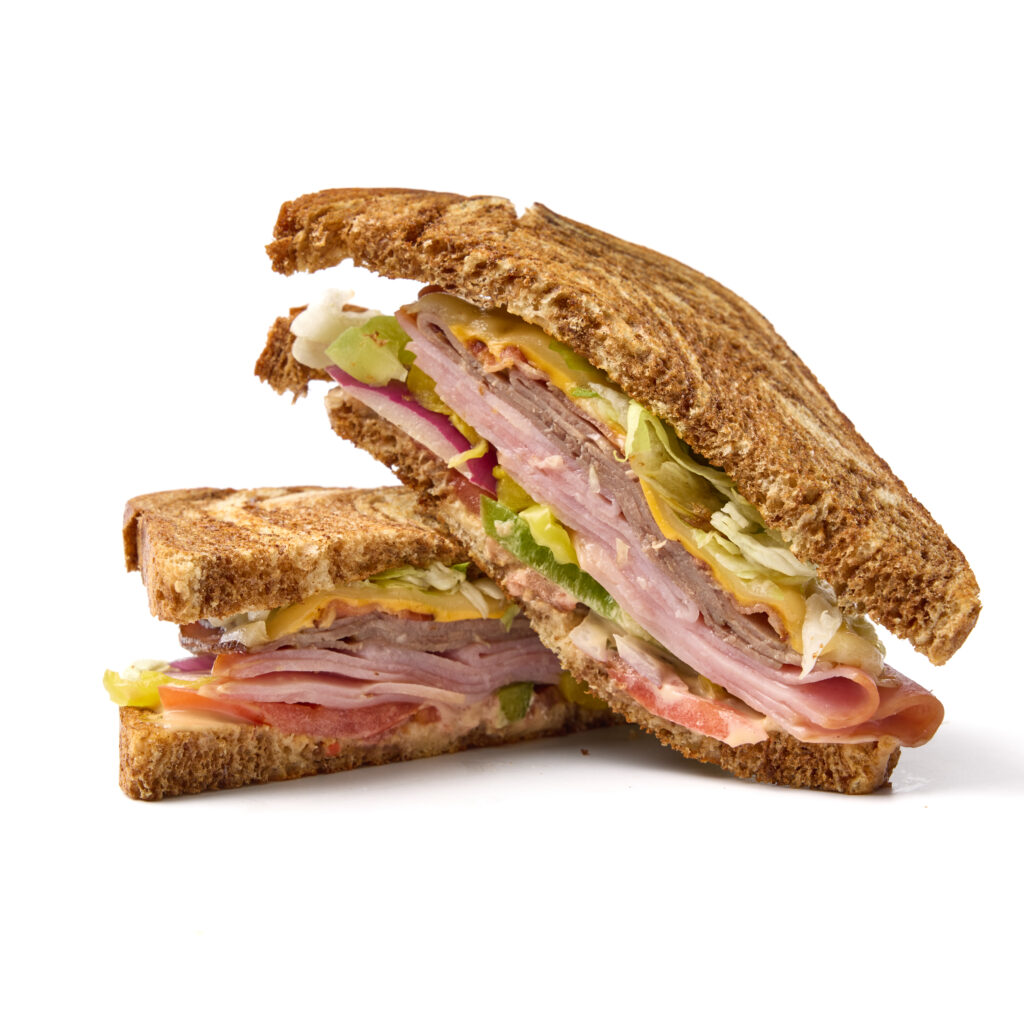 Ciabatta Bread, Garlic Herb Wrap, Tomato Basil Wrap, and Deli’s pick, White or Wheat sandwich loaf bread, White or Wheat Sub, a Croissant, Pretzel Bun or make it a SALAD!